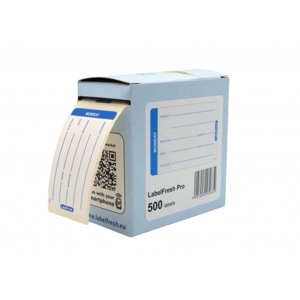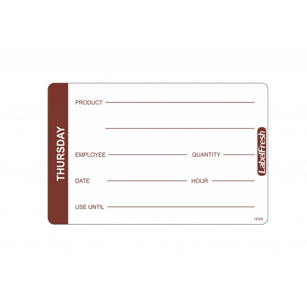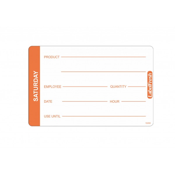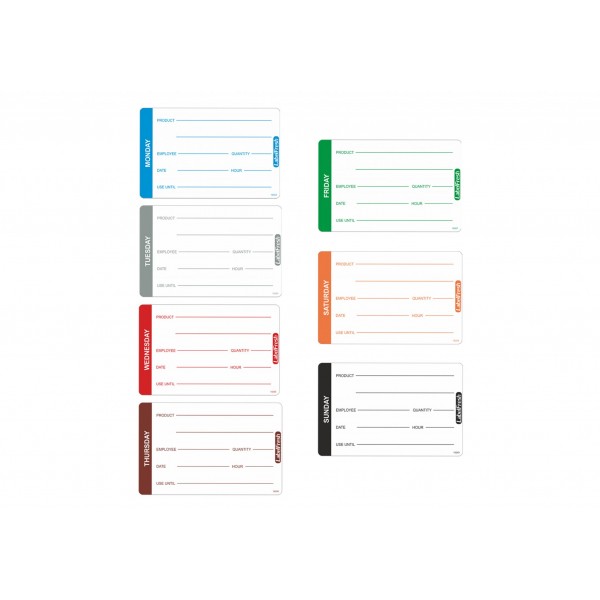 Nalepka vsebuje barvno označen prostor, označen z dnevom v tednu, da zlahka prepoznate pravilen obrok. Vsebuje tudi presledek, ki vam omogoča, da na embalažo vključite dodatne podrobnosti o shranjevanju, na primer datum priprave, rok trajanja, podatke o zaposlenih itd.