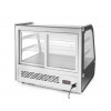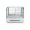 Classic cake display cabinet with double glazing. Bright LED lights ensure optimal product presentation. Stainless steel housing with curved front glass cover and glass side panels. Rear access via two sliding glass doors. Forced-air cooling with automatic defrost; compressor located under the chamber. Includes 2 chrome shelves. LED lighting in the canopy. Digital temperature controller and display.