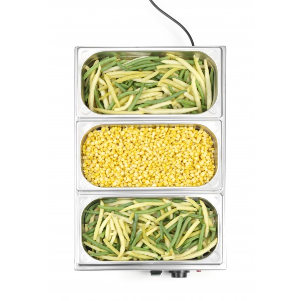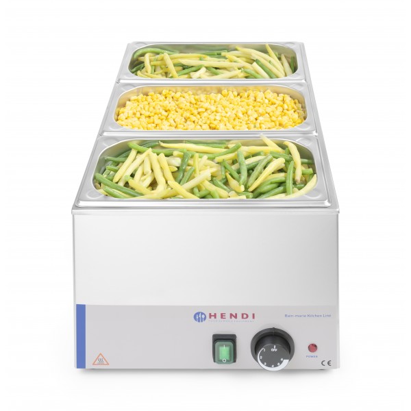 Ranger Bain-Marie postopoma segreje vsebino GN posode ali jo ohranja na nadzorovani, konstantni temperaturi brez gorenja ali vrenja.Zaobljeni vogali posode za vodo olajšajo čiščenje.Je idealen, zanesljiv dodatek za zaposlene kuhinje ali samopostrežne bifeje. Hrano nežno segreje in ohranja stalno temperaturo.GN posode niso priložene v kompletu.Ohišje in posoda za vodo iz nerjavečega jekla AISI 201.Primeren za 1 posodo GN 1/1 z maks. 150 mm višine.Primeren tudi za kombinacije manjših GN posod, kot je 2x GN 1/2 ali 3x GN 1/3.Postavitev posode GN 1/6 je možna pod pogojem, da se uporabi adapterska palica (ni vključena v kompletu, dokupi se jo – kode: 808153, 808108).Temperaturno območje: od 30°C do 85°C.Regulacija temperature z gumbom – 6 stopenj gretja.Opremljen s termostatom in indikatorsko lučko.Posoda za vodo z min. in maks. indikatorji nivoja vode.Zaščita pred pregrevanjem.Vodoodpornost: IPX3.