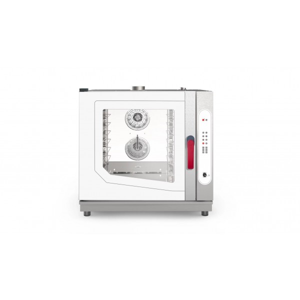 Construction and cooking chamber made of stainless steel, internal lighting with halogen lamps, professional pressure door seal, cooking chamber with rounded corners for easy cleaning, low-emission glass doors, motors with automatic fan rotation reversal, direct steam injection with electronic steam percentage adjustment, side-opening doors, version with mechanical and digital controls.